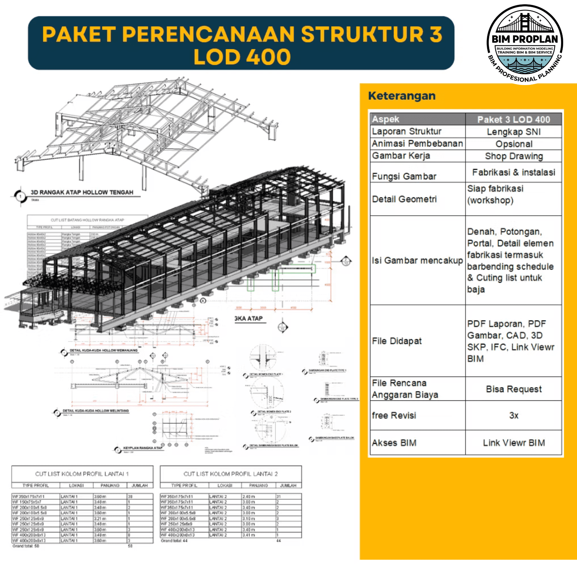 Detail tinggi untuk fabrikasi dan instalasi di lapangan. Sudah termasuk: