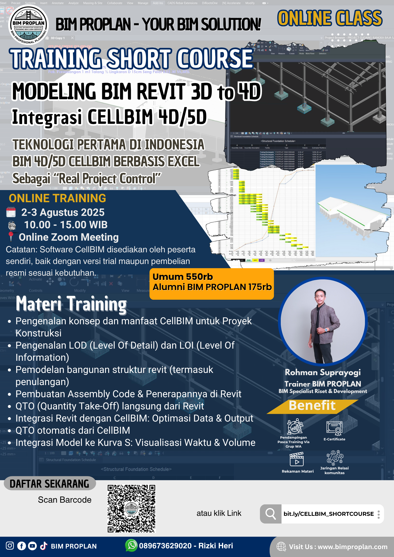 Dibawakan oleh Trainer BIM PROPLAN, Rohman Suprayogi, sesi akan diselenggarakan secara Live Via Zoom dan fokus pada alur kerja inti menggunakan Revit dan CellBIM.